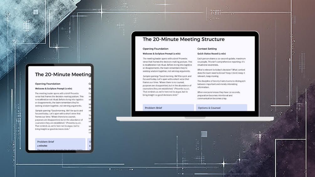 The Wisdom-Led 20-Minute Meeting combines ancient Proverbs wisdom with modern tactical efficiency to help Christian leaders and teams make one high-impact decision, assign clear ownership, and move forward, all in 20 minutes or less.